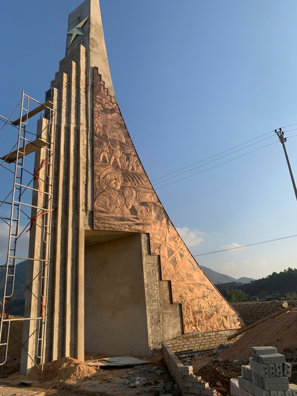 Phù điêu thể hiện trên chất liệu đồng mặt trước và mặt sau, ở giữa là 2 ngôi sao vàng đúc đồng